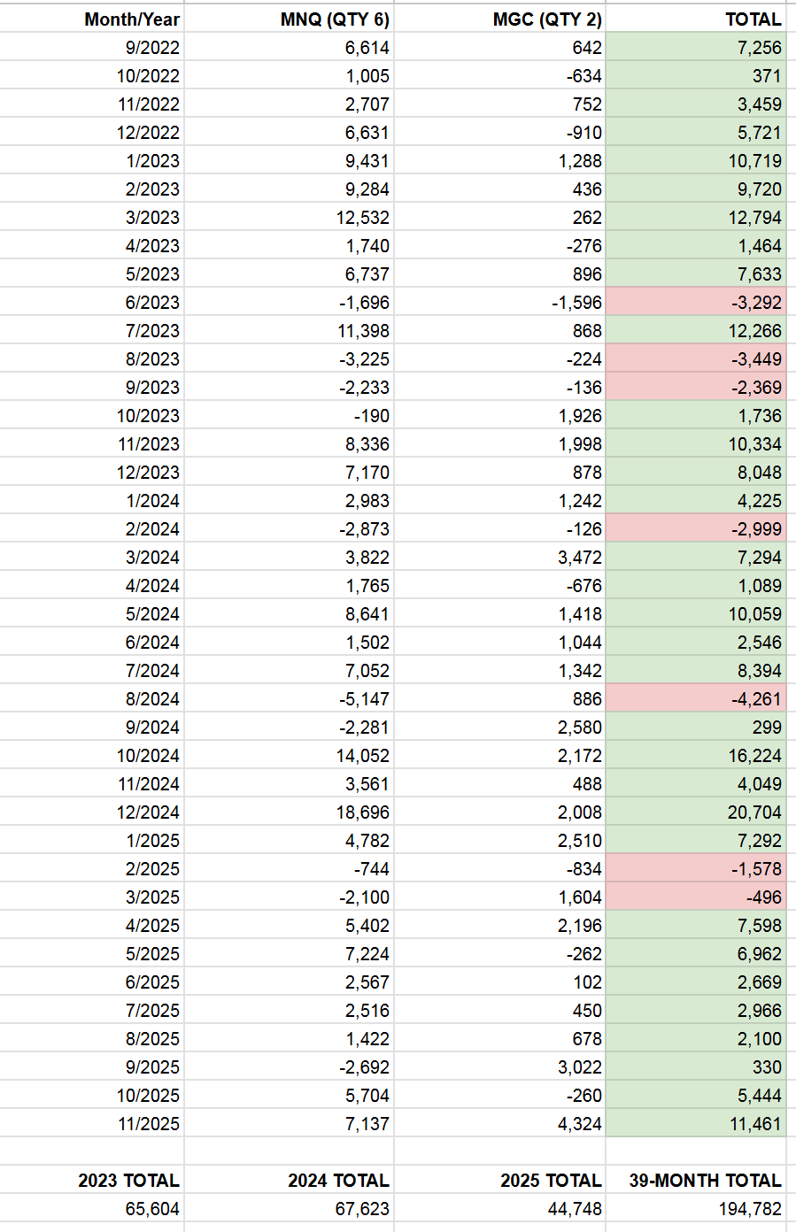 These are the backtested results over the 39 month term - from September 2022 to November 2025. For now, the backtest includes MNQ and MGC, but MES is also compatible with the PF2 - and we're constantly testing new assets to add to the PF2 portfolio. We will update these results accordingly as new assets are added.